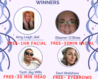 Similarly, Eleanor O'shea has secured the second prize, receiving a free 30-minute facial treatment. Tash Jay Wills has been awarded the third prize, earning a free voucher for a 30-minute herbal Indian head massage. Lastly, Dani Walshaw has won the fifth prize, receiving a free treatment voucher for an eyebrow and lash tint. Congratulations to all the winners!